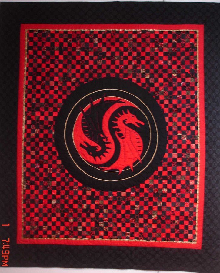 scmurphy550 Dragons - I made this quilt as a get well gift for a friend. Black and red cottons and batiques were used for the 1" squares. Gold brocade was used for the piping around the circles.