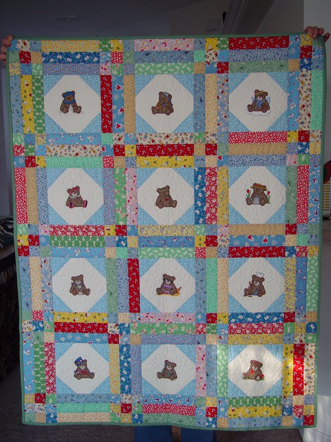 | Design Source - Description | This quilt was made as a gift for the Christening of my nephew. It contains machine embroidered Teddy Bears from Amazing Designs "Plush Pals Teddy Bears Collection I". |