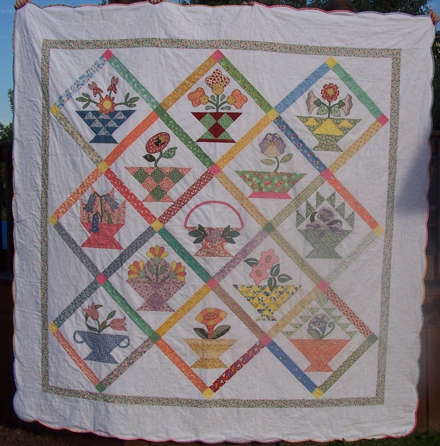 NancyAnn1959 Happy Baskets - A Block of the month from my favorite quilt shop, now closed. Instead of batting, I used white flannel to make it a summer weight quilt. It's quite large and looks really nice on our king bed. This is the 4th quilt I've made with 30's and 40's reproductions and I'm not done with them yet! Scalloping the border was my own idea and I love how it turned out. I used a varigated Superior thread for the machine quilting. On the borders, I used Quilting by the Roll. Very fun!