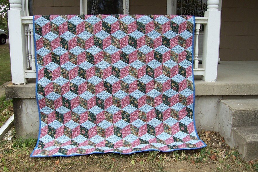 KathySamson Stitches away from Happiness - Stitches away from Happiness is a tumbling block pattern made with three diamonds sewed with the Y. Seam. I quilted each block in the ditch then feathers on each diamond. I Rolled my pants legs up and I dove in!!!