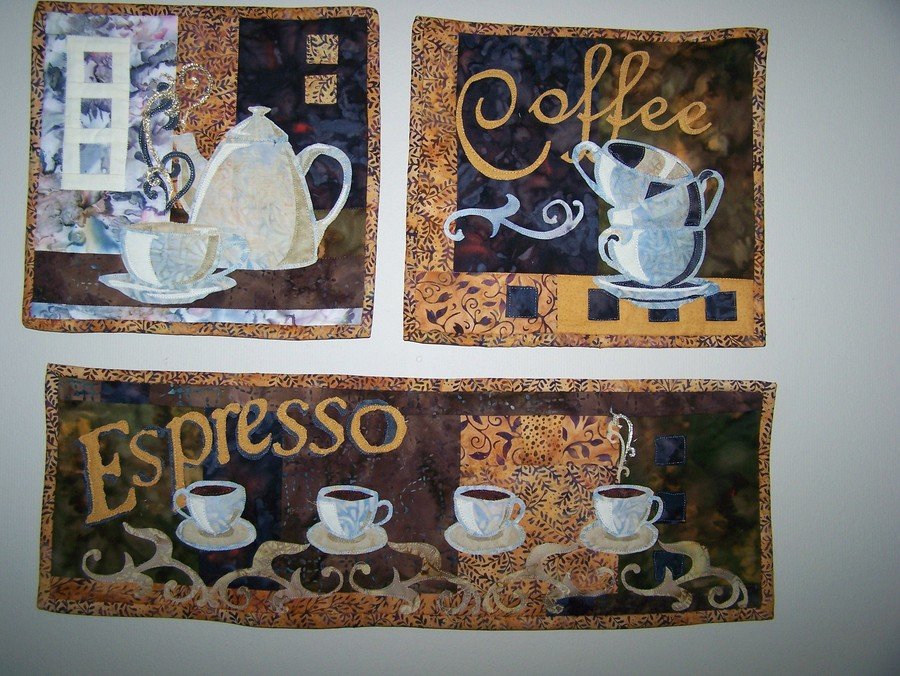 linmcquilter Coffee Trio - Trio of small quilt wall-hangings, designed by McKenna Ryan. Background is pieced, with raw-edge fused applique. "Steam" is depicted with a combination of fabric applique and angelina hot-fix fibers. Height & Width measurements are from all 3 quilts as they are displayed in photo.