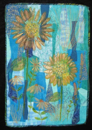 skb2000 Sunflowers in Blue Greens - Lots of paint and free motion quilting on top of random applique.