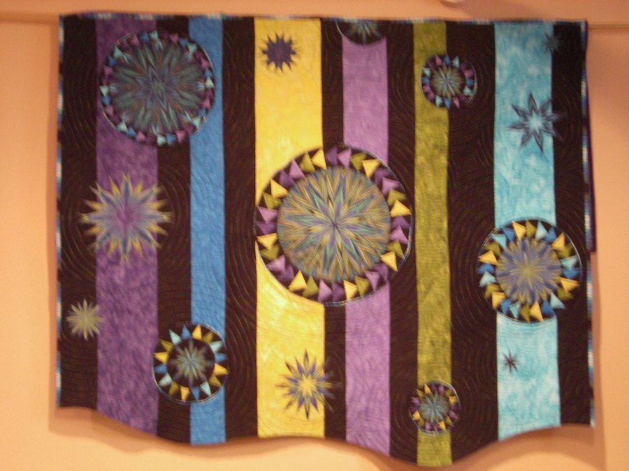 | Design Source - Description | Wall hanging made of circular flying geese and ny beauty segments set against a strip pieced background. All circular components were drafted by me, and was inspired by the fabric. |