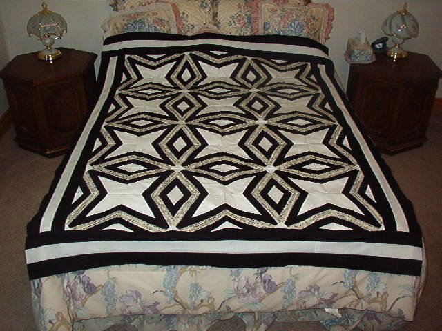 speedyqltr Harmony In Ebony and Ivory - I made this with a piano in mind. I used black and ivory fabrics, along with sheet music fabric to make the top. The backing is one piece of black with small musical notes scatterd randomly all over and piano keys border either side, one larger than the other. I have yet to finish this quilt, but I will be tying and hand quilting it to finish it. I will bind it with the sheet music fabric. It will also have a label on the back dedicating it to someone special both "instrumentally" and "musically" in both my daughters' lives.