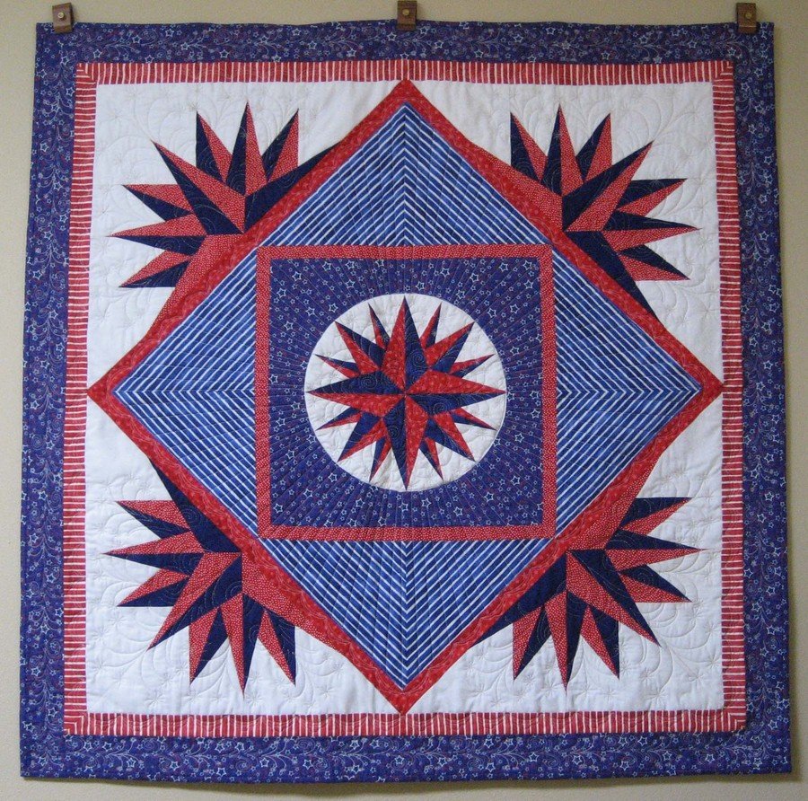 joytoquilt American Mariner - Took a class with Chris Lynn Kirsch at the Wisconsin Quilt Expo in 2006. I got a quarter of the center done in class and then finished the center compass over the next week (so I wouldn't forget how to do it). It sat in my quilt studio for the next year and a half while I looked for coordinating fabric and pondered how to complete it. Finished it this spring. It's longarm quilted in silver metallic thread with fireworks and bunting.