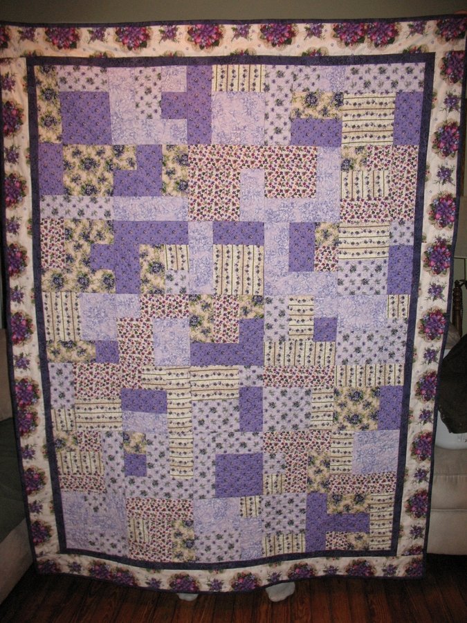 laur812 "My Life" - I used purple flowers from the Vintage Violets fabric collection for this quilt that depicts my life. Yellow Brick Road represents the road I have travelled thus far. The purple colors represent the passion for life. The flowers represent the notion of taking time to smell flowers. I did loopy free-motion quilting and that represents the ups-and-downs of my life, mostly of my last few years in which I have had to deal with colon cancer and a recurrence in my lung. This is my favorite quilt that I have made because it represents "my life".