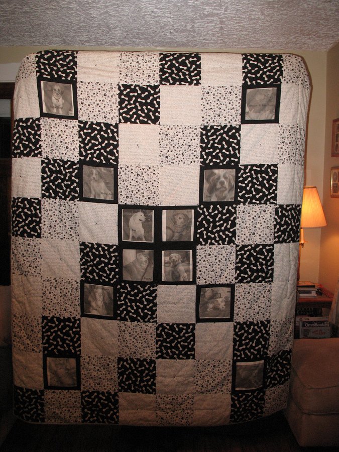 laur812 Christopher's Quilt - Memory quilt made for my son Chris with pictures of all of the dogs we've had during his lifetime. Black & white quilt dog-print fabrics with black and white photos of our dogs used. He wanted it to be "thick like a comforter" so I used 2 layers of extra loft batting and hand-tied it.