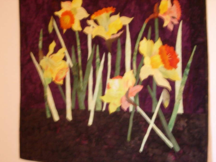 Windy It's Spring again - I love to paint with fabric. Much of my fabric if full of holes where I have cut to get just the right shading. If you look closely, the tip of one of the leaves is dimentional and the flowers have beads in the center.