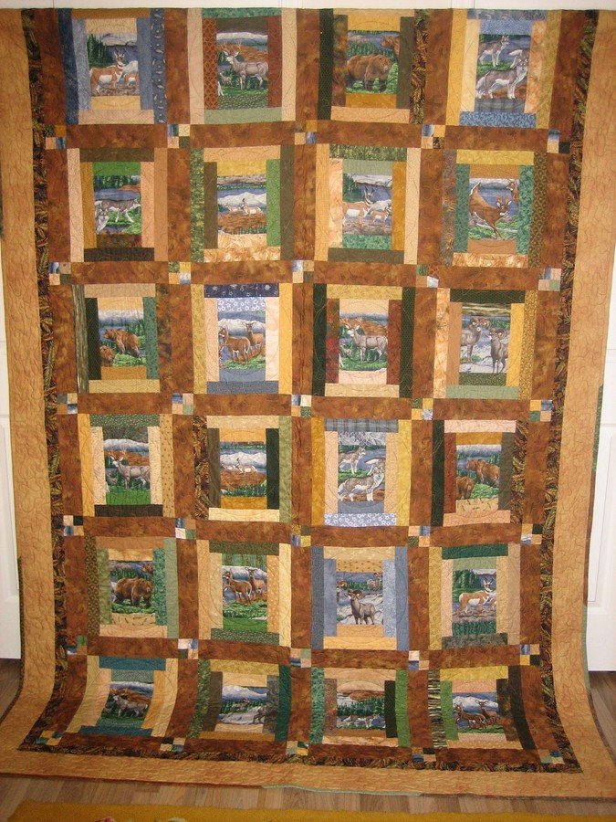 | Design Source - Description | Printed yardage of wild animals used as center of block for grandson who loves to hunt. Quilted circles around animals to resemble target area. |
