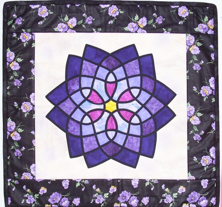 | Design Source - Description | I love doing bias tape stain glass quilts and have done several usually flowers. This is the only one I have kept for myself. Several were sold at guild silent auction and my friend owns 3. |
