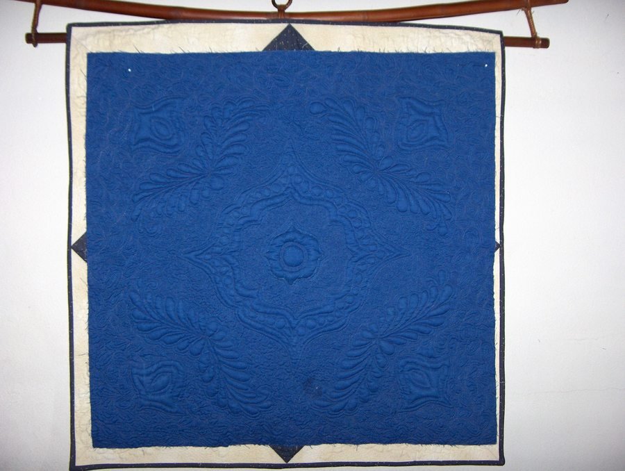 | Design Source - Description | I took an original, Rhapsody-based design and turned it into a small whole cloth quilt. Purle 100 wt silk thread on Royal Blue cotton sateen. Quilt is not yet bound in this photo. |