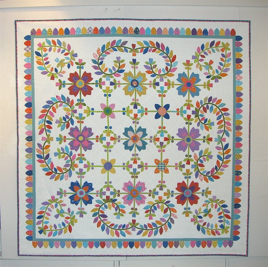 | Design Source - Description | Nine Country Whig Rose blocks + four deconstructed blocks. Vine border is original. Invisible machine applique. |