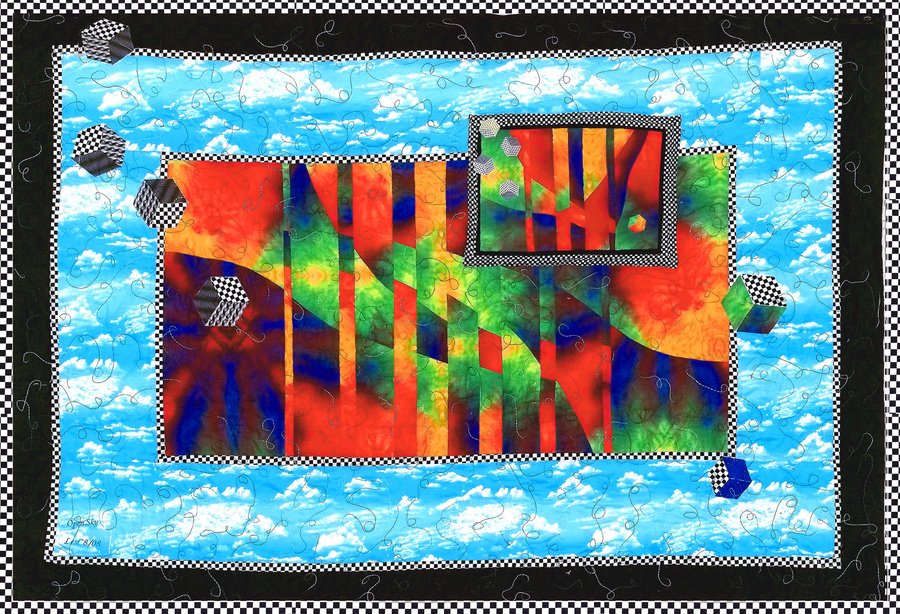 Lester Open Sky - I took the convergence idea and added my touch. I like cubes and open sky, I made the cubes from my black and white which I have in everone of my quilts. I also made a small repleca of the lrg convergence and placed it in the lrg one. I could not quilt the small one because of the thickness of the quilt already. The small cubes on the repleca are all made of real fabric.
