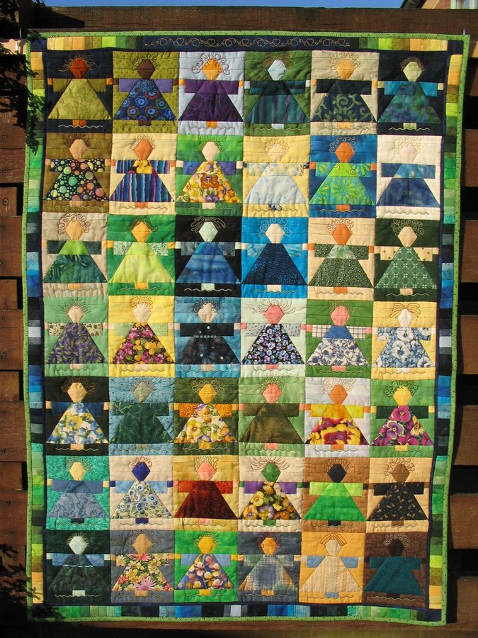 Eugenie Little Ladies - This quilt was made for Ariane by her other friends and me to comfort and support her with her unexpected loss of her son. The quilt was made in january 2008. Her son died at the age of 32 at a sudden heart attack in december 2007