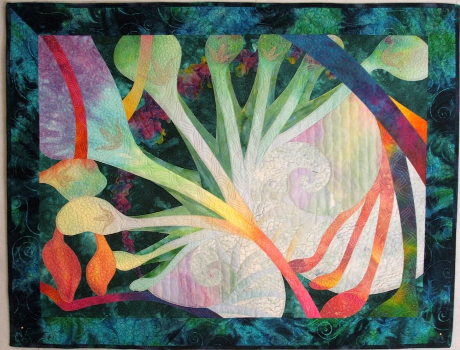 SandyinCO Gemini (Front Side) - Gemini is two-sided, therefore, its name. The shapes you see on the front are repeated on the back, but in reverse (never will I do this again!). My design isn’t meant to depict anything in particular, so what do you see when you look at it? I used commercial batiks and hand-dyes and some fabric painted by myself. I quilted Gemini using metallic threads on the front and invisible thread on the back