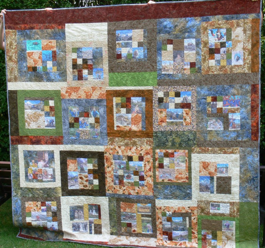 | Design Source - Description | Used Printed Treasures to include pictures of my Father's travels on the back of this quilt. Used map fabrics and the machine quilting is oak leaves and acorns as 'home' is called Twin Oaks. |