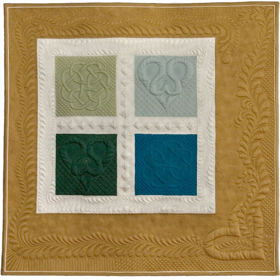 dflquilts Not Quite Centered - This piece began as a practice sandwich and prototype for a larger quilt. “Not Quite Centered” explores celtic motifs and background fills with different colors of silk thread (used in both the needle and bobbin). The top is silk/cotton sateen and is layered with Hobbs wool batt