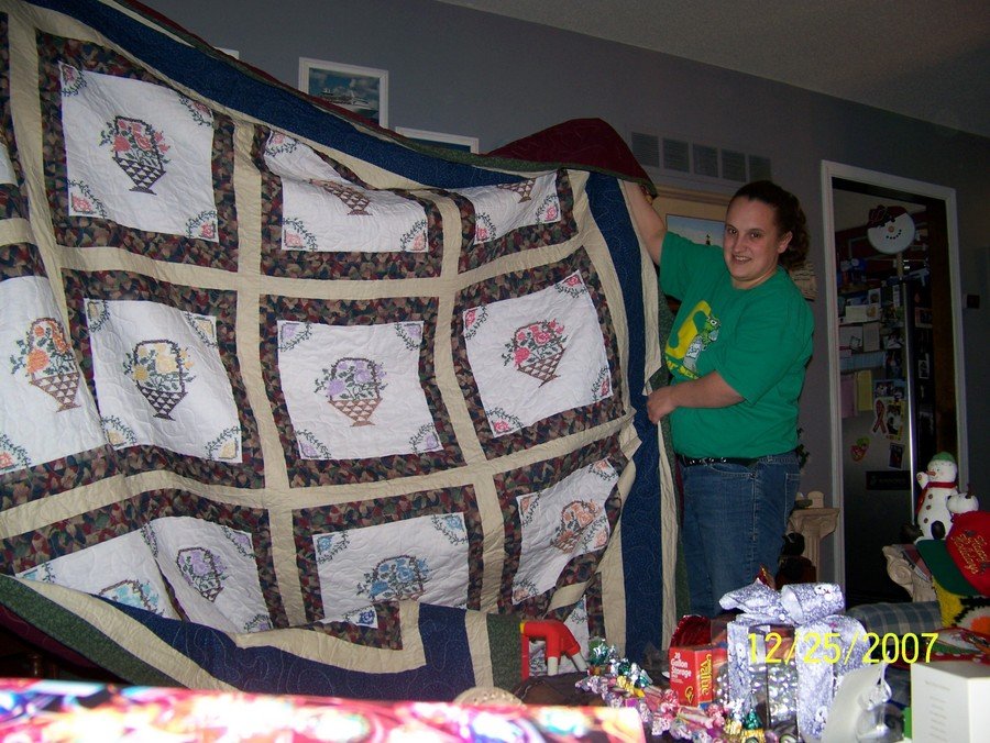 Beeda Grandmothers Baskets - My mother in-law Lola McCann started this quild before getting sick and passing away. My Daughter wanted a good Quilt from her so I finally finished it. With the color of trim work she wanted and after 10 yrs. Michelle and husband Matthew were thrilled. The tag on the Quil says Started by Lola McCann and Finally finished by Brenda McCann 12/2005