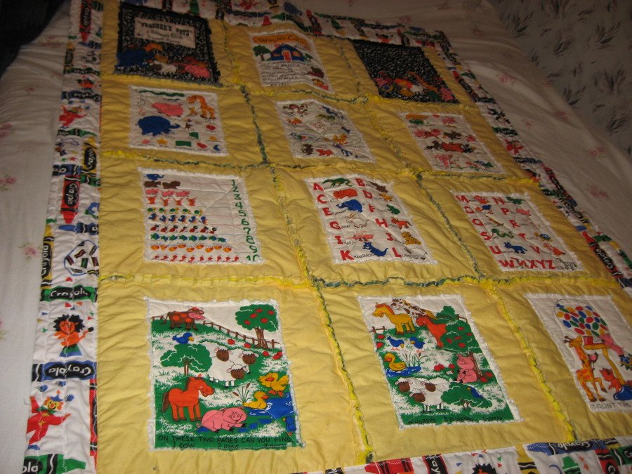 | Design Source - Description | Soft book panels set in blocks, machine quilt each block to cotton batting and flannel,added a border, rag cut blocks. Back blocks make a rail fence pattern. |