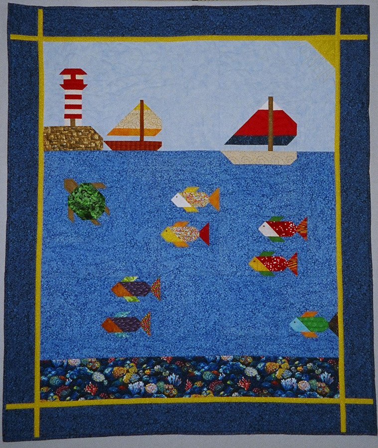 | Design Source - Description | This quilt has sailboats and a lighthouse above the water, and a turtle and several fish below the water. It was made for my sister's first grandson. |