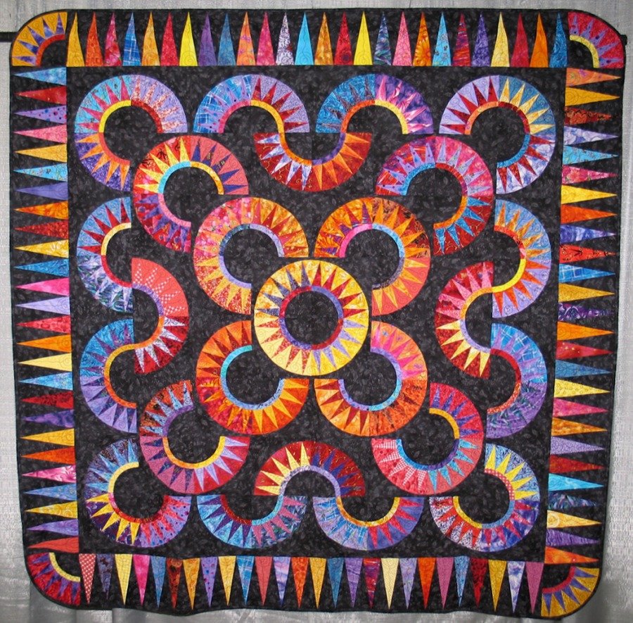 nancycarol Butet's Beauty - I made this quilt in 2005 for my sister-in-law Butet. She likes bright colors with black, so that’s what she got. Although my hubby said that the quilt looks like a "nightmare", both Butet and I really like the colors and the drama! I drafted the New York Beauty block and the border using EQ5 and pieced them using paper foundations. This is the first big quilt that I have quilted entirely on my domestic sewing machine. That was a challenge...exhausting, but so much fun that I will definitely do it again!
