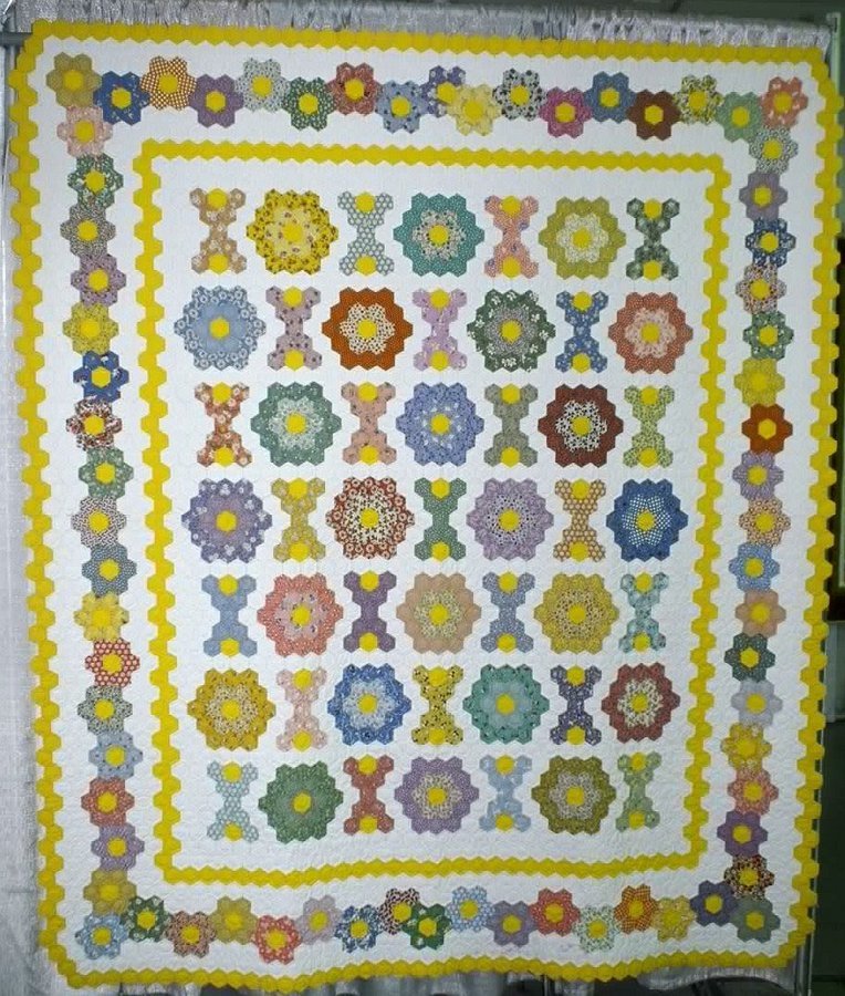 Granny Nan's Hugs and Kisses - I pieced this top with a method similar to English paper piecing and thoroughly enjoyed the process. However, I learned a hard lesson: WHAT NOT TO DO WITH A BALLPOINT PEN. When I finished the quilt and washed it, the ink ran onto the white background. After I cried a little, my next thought was to hide the quilt. But then I decided that the quilt should not be punished because of my mistake, so here it is. I love it in spite of its flaws -- like a wayward child! I hope someone else learns from my sad experience.