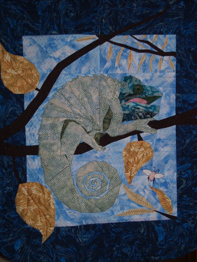 | Design Source - Description | Fabrics chosen to match my brother's pet Iguana, named Cinnamon. Foundation pieced, and trapunto lizard on a naturalistic background. |