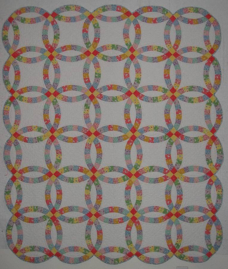 cblong03 Double Wedding Ring - I started this quilt in 2006, before I knew I wasn't supposed to be able to make such a difficult pattern. I've worked on it on and off over the last 2 1/2 years and finally finished it this month! I used Sharlene Jorgenson's templates and instructions. I hand pieced the connecting corners, but the rest is done by machine. In the spirit of this quilt, I figured I'd go ahead and stretch my beginner free motion quilting skills and do feathers in each of the rings (marked, of course!). As soon as I get a label on it, it's going to live in New Hampshire with my friend from 1st grade. I love the 30's reproduction fabrics, but it isn't my decorating style.