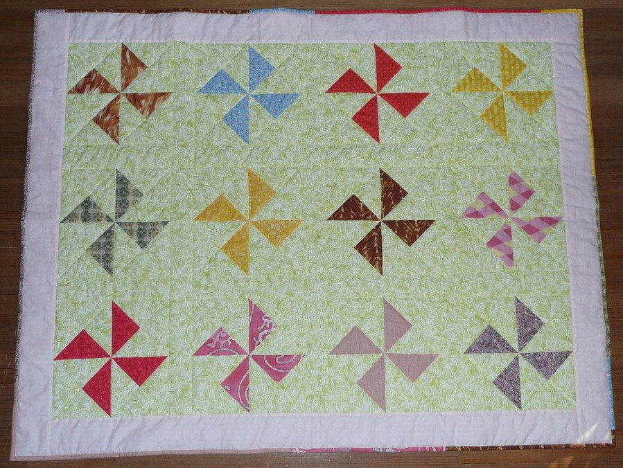 rkatika Linda`s pinwheels - The quilt top was finished a year ago but did not have a large enough table to baste it. A few weeks ago I went to home depot and got an 8'x4' wood and made a folding table out of it. Now I had a large enough surface to tape the quilt backing down and pin baste the layers. Just finished it last night.