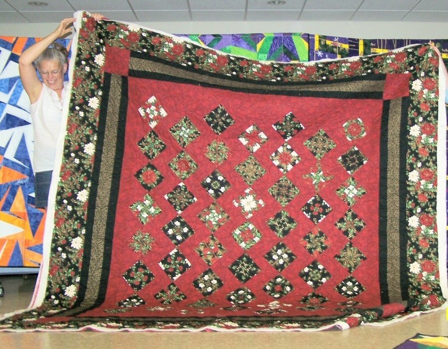 LadyRags Christmas Kaleidoscope - 4 patch Kaleidoscope cutting technique. Traditional Zig Zag or Bolt of Lightening on point setting. The quilt is being displayed at EQS guild meeting.