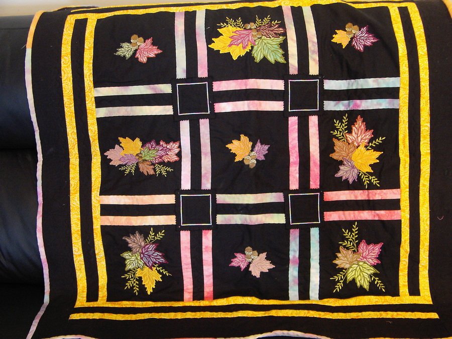 marley Gramp's quilt - I made this quilt for my Dad, using my own hand dyed fabrics. I have used a machine embroidered applique technique. I think the designs are from Sew Swell. I like my quilts to have things hanging from them, so for the sashing squares (if that's what you call them) I cut out squares using my pinking scissors, and then sewed them on using a satin stitch and variegated thread. This quilt is a lap size, and has black polar fleece on the back.
