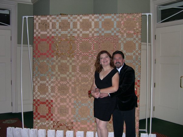 denise-nh Miranda's Wedding quilt with Mom & Dad posing! - Signature quilt for my Daughter Miranda. The blocks were partially assembled and then signed by family and friends at her bridal shower and also her bee group. It was a mad dash to finish the top, quilted by my Long Arm Quilter - Diane Trottier and then hung in time for the wedding reception for all to see. Quilt was designed by family and friends, assembled by her mom and then quilted by a bee member.