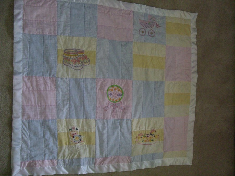 lcarolyn kaylee grace's birth quilt - kaylee grace is our second grand-treasure. she was born in august 2008. it is pieced from pink, yellow, and blue gingham. the embroidery is from the anita-gooddesign vintage baby collection. the quilting is in the ditch as i felt there should be no competition with the embroidery.