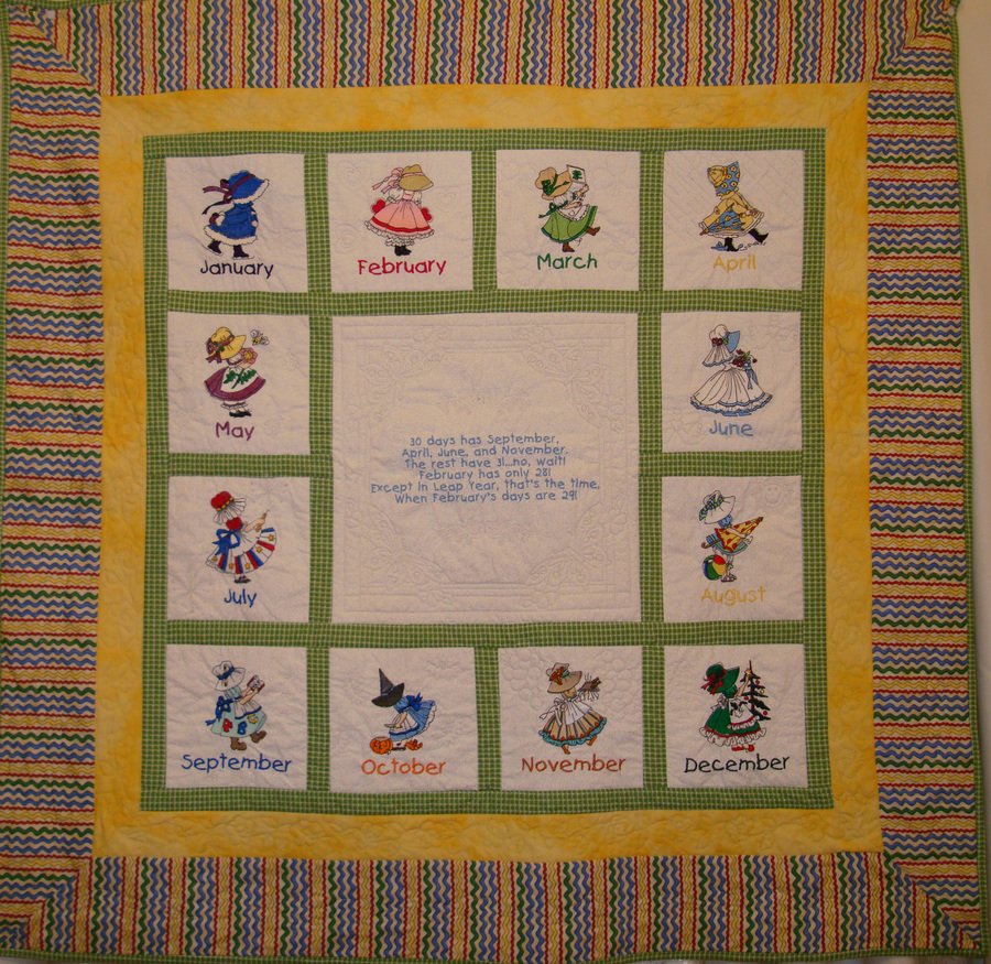 Libbi To Teach and To Learn - Embroidered Sunbonnet Sue characters representing each month of the year surrounding a version of the "days in a month" poem. Constructed as a learning project for software and embroidery features of Bernina 630.