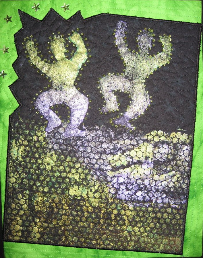 MissLani Dancing in the Dark - Journal Quilt using Lumiere paints, , hand made sponge stamp and beaded.