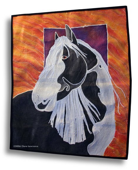 ClaraLawrence Gypsy Fire - Inspiration was taken from my photos of a herd of draft horses. This one stood out to me with the way her neck was so graceful as she looked on. The piece is painted with handdyes and embellished with yarn in her mane. My boys helped me paint the fire like background. That part was my favorite for sentimental reasons.