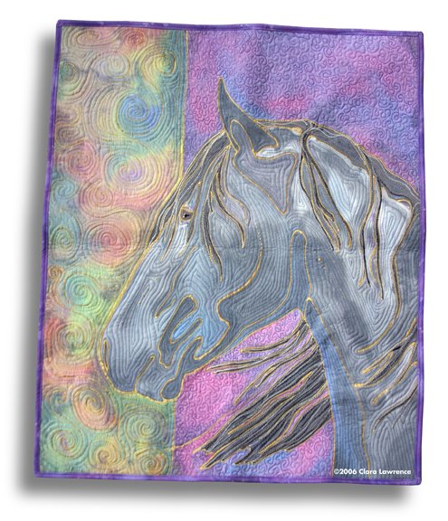 ClaraLawrence Serene - This was my first atempt at dying with resists. This resist has a gold color in it. I also learned that you can wash most of the color out if you don’t poperly set the dye. However, I really like the effect it gave in the end. I also did extra satin stitching in the mane to add texture.