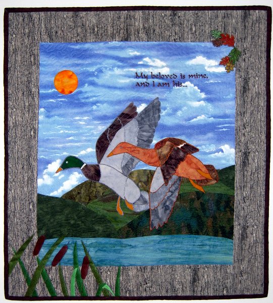 Sewdreamy Flying Together Through Life - FIrst of an ongoing series of miniature quilts in memory of my husband Marvin. All commercial cotton fabrics, machine embroidered leaves and cattails, machine quilted with silk. Ducks inspired by a Dover coloring book picture.
