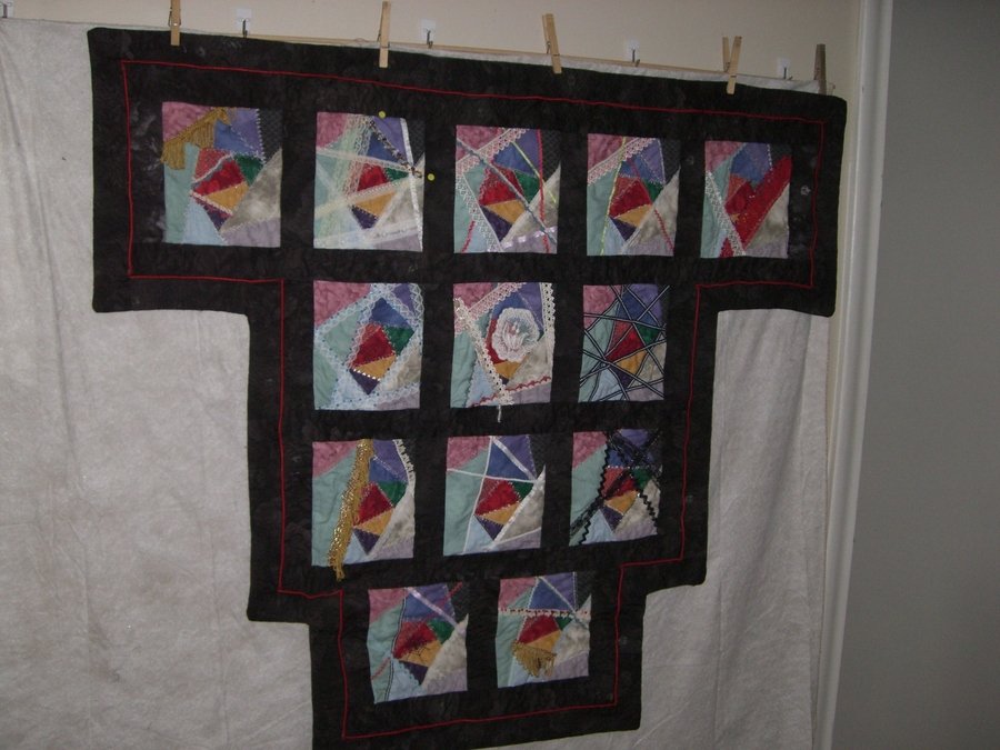 lcarolyn primarily crazy - this quilt began as a practice putting together crazy quilt blocks. using batiks instead of silks, woolens, or velour, in an attempt to bring the blocks into this period of time. the back is unique as well. i used a large cross stitch hand embroidery, in red, to mimic the piping on the front to attach the borer and the rod pocket.