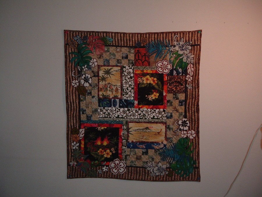 gunnywendy Hawaiin Fantasy II - I purchased a variety of fabric while on vacation in Hawaii in 2006, but I didn't know what to do with it until issued a challenge from avery small gallery to do something with some fabric scraps the owner had. Well, i used what she gave me along with the fabric I bought and this was the result. I just sent this quilt to my sister in Oregon to use in a silent auction to raise money towards a non-profit agency. I hope it helps towards raising money, but I won't know who ends up buying it. I hope they enjoy it whomever that is.