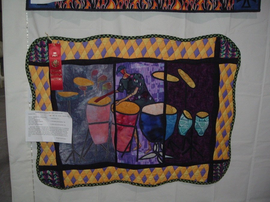 gunnywendy Jazz Drummer - I worked on this quilt with two other quilters on a website that gave out a fractured quilt challenge. We were to find a picture that we could enlarge and then cut apart and send those parts to the other two quilters. When we got those sections back, we were to sew them together and then quilt them. I think I ended up finishing mine first as it was intended to be a graduation gift from high school for a grandson who had been a drummer for his high school band and jazz group. I got it done and he seemed to like it. I did one of a Harley motorcycle for another grandson that graduated.
