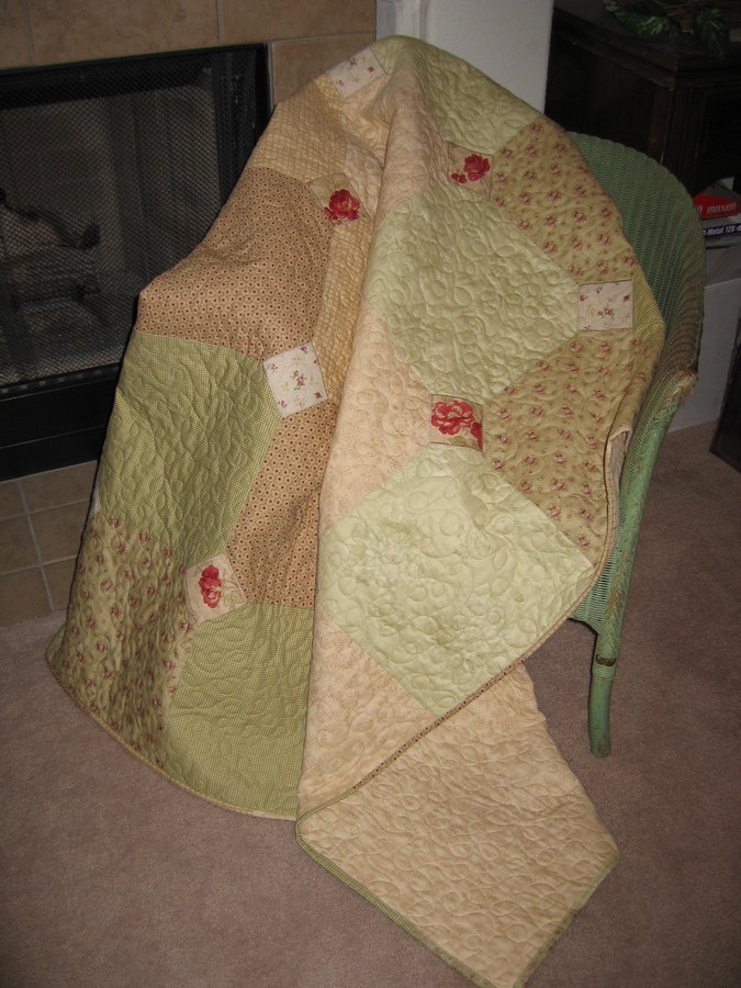 | Design Source - Description | This is a quilt my sister made. We picked out the fabrics together, I showed her how to make the quilt and the appliqued "diamonds." When she was finished, I machine quilted it for her. |