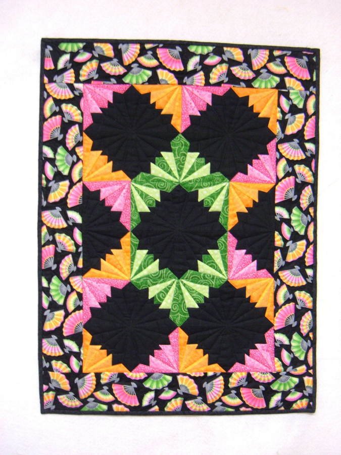 dreamquilter Fans All Around - I had this small piece of fan fabric and loved the bright colors on the black background. I figured out how to use the maximum amount of the fabric for borders and that determined the size of the quilt. I drew the fan pattern on EQ6 and paper pieced the blocks.