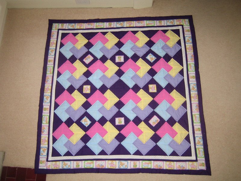 Quilted sashiko-style using Perle. Borders added Quilt-as-you-Go. Motifs cut from border-print appliqued within the quilt to support Nursery genre. New owner born prematurely on 7th November, 2008 |