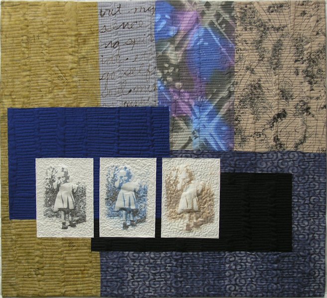 | Design Source - Description | Photo transfer on dupioni of photo of myself when I was 3 or 4 yrs. old. Words associated with meaning "self" were hand written on fabric as well as rubber stamped lettering. Machine quilted. |