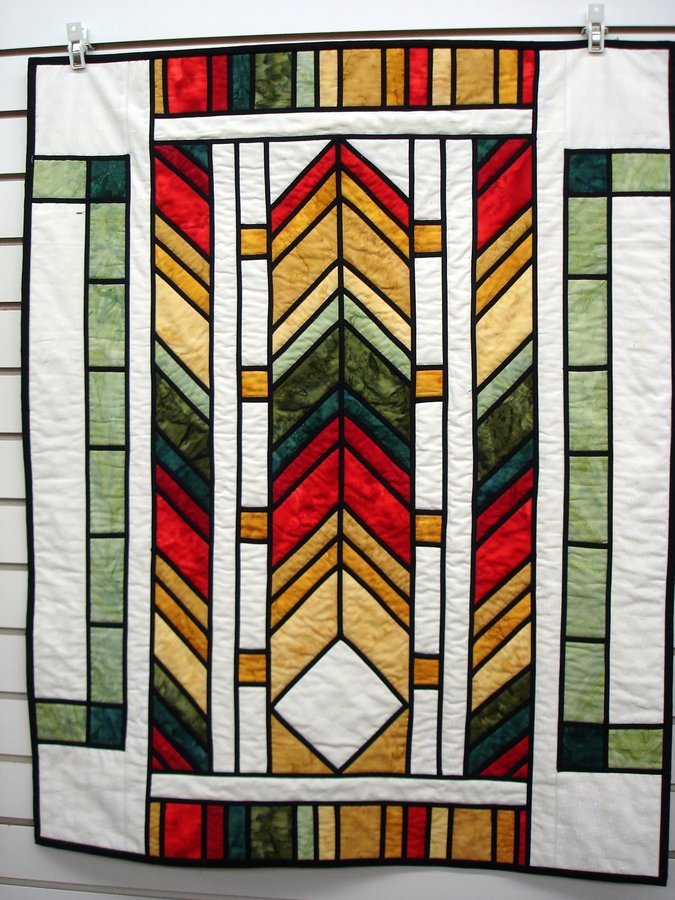 katherinequilts FLW - This is one of my first three quilts done at the same time in 2005. I used batiks and my own ideas for color, not those from the book or the actual window. This quilt was sewn in class using the pattern modified by our teacher Diane Monde at East Aurora Sewing Center to use bias tape instead of small strips of black fabric.