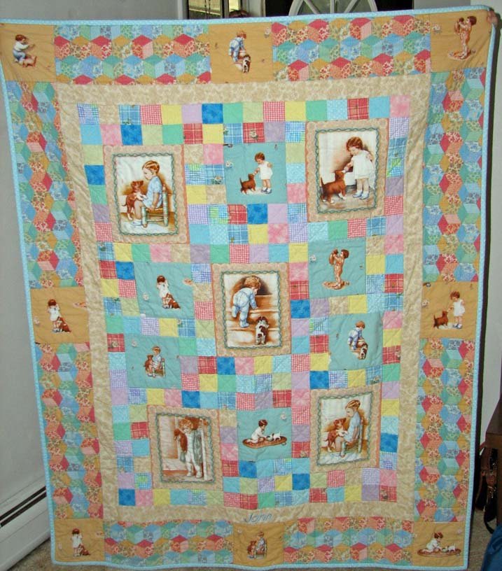 Quilteer Sweet Dreams John - I saw this in the Fons & Porter magazine and discovered a month later that my first grandchild was on the way. The Bessie Pease Gutmann pictures caught my eye and I was thrilled to see that one of them was the picture that hung in our daughter's room when she was young. I started buying fabric and planning the quilt before I discovered that I had twin grandsons on the way, so back to the store where some frantic searching took place since some of the original fabric was no longer there and I had no time to look elsewhere! There are several subtle differences between the two quilts (e.g. James’ quilt has blocks with blue background in the border, while John’s quilt has blocks with beige background in the border). The quilt was completed in May 2006. "John” is machine embroidered across the bottom, on a sashing strip.