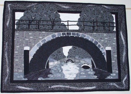 PitchPinePenny Amsterdam Memories - This wall hanging was an entry in the Black and White "family values" challenge of the Clamshell Quilt Guild, and came in second place.