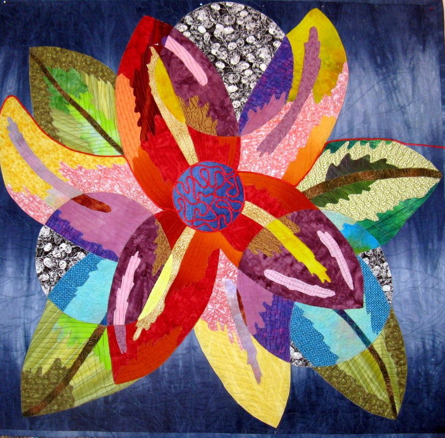 barngirl Triple Trillium - This was made for Milwaukee Art Quilters Challenge ... we had to have a red rattail cord run in one side and do something within the quilt and then run out the other side. These quilts when hung in a show together will be attached with the rattail cords holding them together.