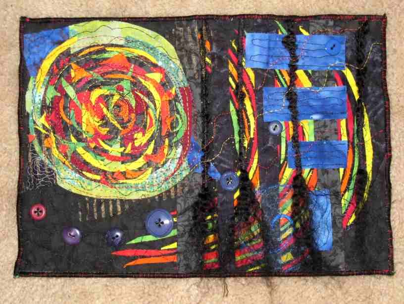 brenn1 Nested Development - Again, part of my art quilt workbook series. The technique for this one was "collage". It really did turn into a collage as I started to make it, hated it, cut it apart, added more, kept working on it, made a mess, then finally reached a stage where I liked it.